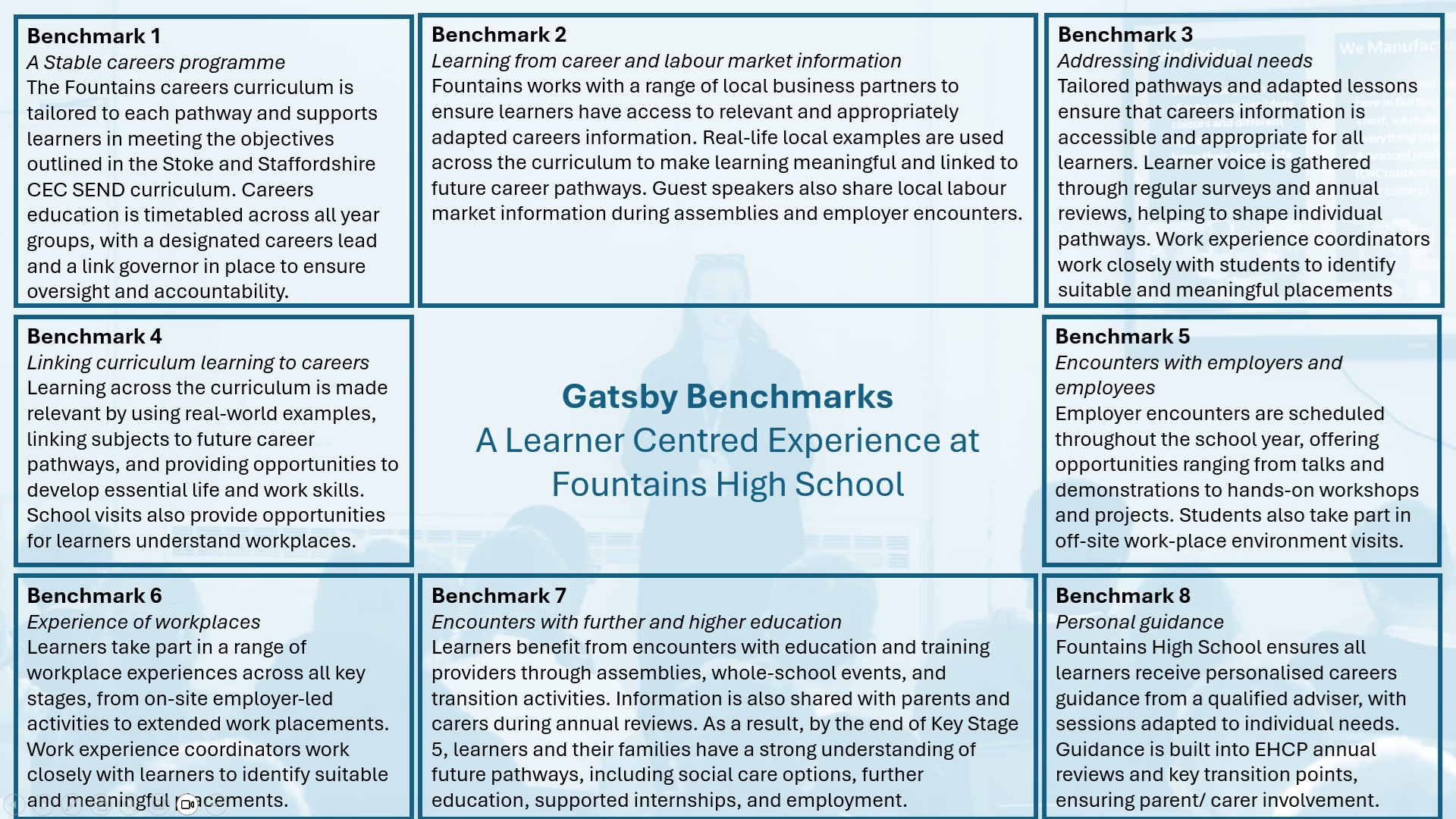 Fountains High School is committed to delivering high-quality careers education by meeting all eight Gatsby Benchmarks. We provide employer encounters, work experience, and personalised guidance to help every student prepare for life beyond school.